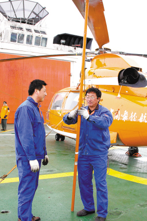 老杨是直升机组的机械师,同时还承担了地勤工作。每当有任务的时候,他总要提前半小时准备飞机,为机身除霜、除冰、解除固定装置、检查飞机状态等。南极天气变化无常说变就变,有时飞机刚刚准备好,天气突然变坏,马上又转成待命状态或需要紧急加固;有时突然有个紧急任务,老杨又以最快的速度使飞机处于备航状态。由于这次考察只携带了手动油泵,每次直升机加的500多升油,都是老杨和另一名机械师老唐一下一下用手摇泵摇上去的。