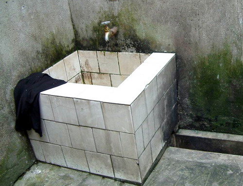 图为薛宏福溺亡的水池,位于放风区一角,平时供拘留人员洗衣、洗漱、蓄水等,内长55厘米、宽47厘米、深46厘米,平时是干的,使用时可用抹布堵死下水口留存水。