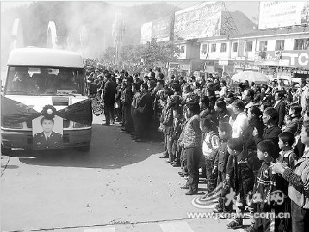 在运送刘民骨灰的灵车前往烈士陵园的路上,德兴大街上有万余名群众为英雄送别。