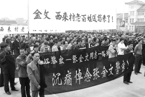 “金文,你慢慢走好”“金文,西来的村民送您来了”“金文,你永远活在我们的心中” ……各界群众举着自制的挽幛,低低的啜泣声弥漫在人群中。据估算,当天前来为张金文送行的社会各界群众和干警有5000余人。这么多人为一位普通民警送行,在靖江还是头一回。
