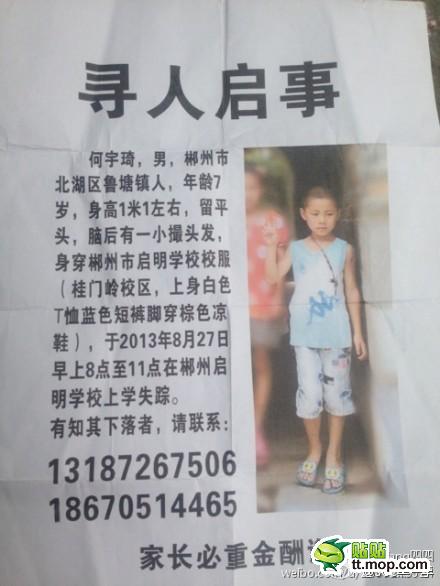 何宇琦7岁男,8月27日中午湖南郴州市启明学校放学路上被拐。9月8日启明学校路上公厕化粪池发现尸体,凶手凶残头皮被剥内脏腐烂模糊不全,头颅裂开。(有理由怀疑是活取器官)目前郴州市公安局也无实质性进展。呼唤大家扩散,抓主凶手,为他平冤!