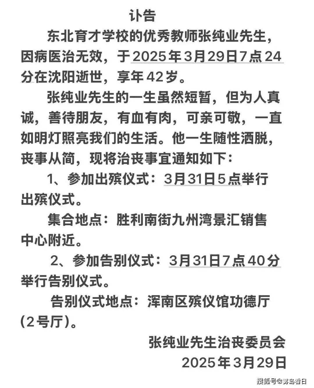 东北育才学校语文教师张纯业逝世,终年42岁