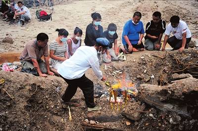 祭奠 一家人在祭奠埋在废墟下的亲人。本报记者