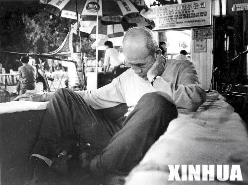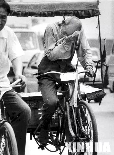 白方礼老人生前照片――老人在蹬车间歇打盹(1994年摄)。新华社发 李锦河 摄