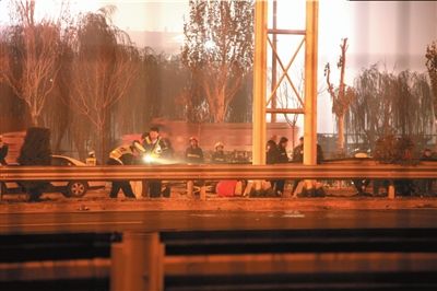 事发地点位于南四环公益西桥以西约500米处由东向西的主路上。昨天凌晨2点多,在距离事发地点东侧约200米处,有警车停在路中间,多名民警站在四环主路上,提示前方有事故,要求过往车辆避让,但不能逗留。