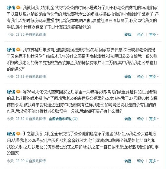 穆涛的妻子于今日凌晨利用穆涛的微博发表第一条关于遗产纷争的微博,称火化仪式上收到的礼金被穆涛婆家的家属“私吞”,不愿意用于穆老师伤葬费。据穆涛妻子说,原本双方已经说好,火化当天收到的礼金将用于买墓地所用,而且穆涛妻子已经按约定全部上缴给公公。但由于当天收到礼金数目较大,穆家人就反口转变态度。“结果我老公26号火化当天所收礼金金额较大,他们家就改口说那个钱是给他父母的和我没关系,之后我老公的伤葬费也没在之中扣除。”