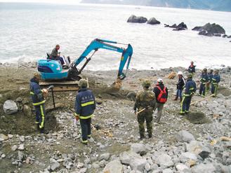 台军特搜中心吊挂官兵及挖土机,在苏花114.5公里处海边开挖搜寻。