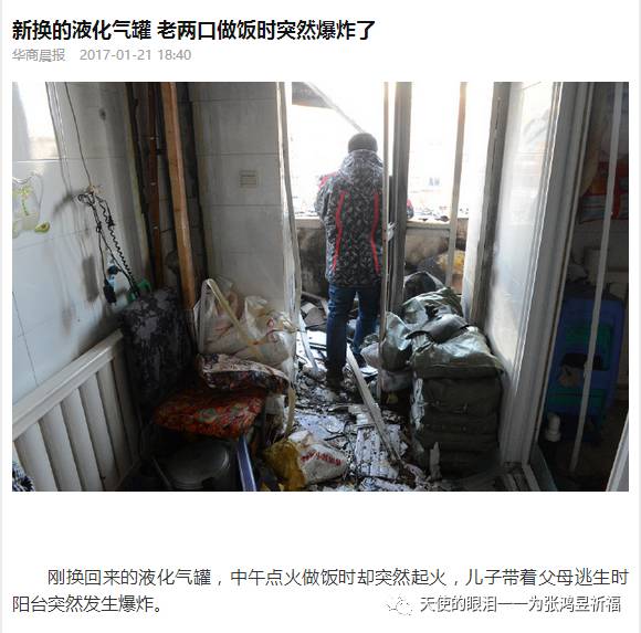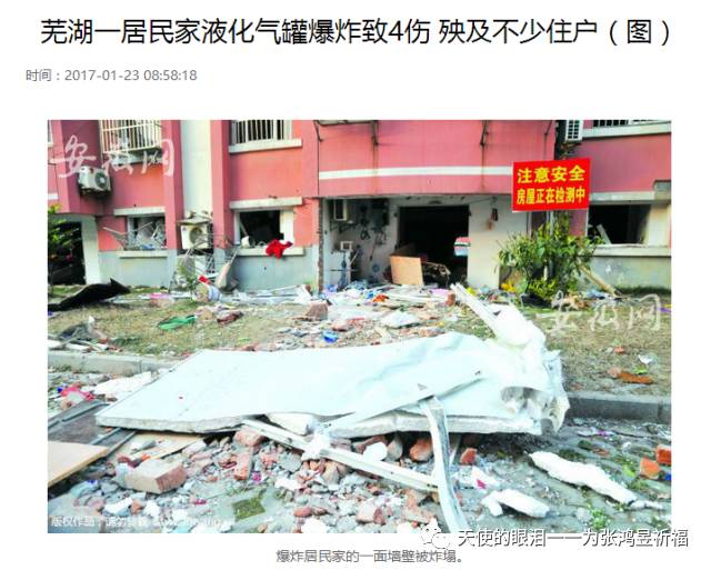 2017年1月21日中午,辽宁沈阳苏家屯区一住户家中液化气罐爆zha。 2017年1月21日晚,安徽芜湖一居民家中液化气罐爆zha,造成4人不同程度受伤,殃及周边住户。 2017年2月4日晚,江苏无锡市一民房发生了爆zha,一位九旬老人在家中被困。 2017年2月5日上午,浙江台州一足浴店发生火灾,造成18人死亡,2人轻伤。 2017年2月6日晚,湖北武汉汉阳居民楼发生液化气泄漏,导致爆zha,起因是住户液化气坛阀门故障。 2017年2月7日晚,山东济南一煤气私灌店发生燃bao。 2017年2月8日下午,湖北荆州七旬老人在家做饭,煤气灶突然爆zha。 2017年2月10日早上,吉林昌邑一小区发生爆zha,多户居民家窗户被崩飞。 我们再次提醒大家 检查燃气安全 检查供气公司资质 检查物业管理的责权划分 我们在发生燃气大爆zha后,才发现供气的喜威燃气公司: 1、很多业主反映入住十余年来,只是偶尔数次见到喜威做常规检查,有的业主甚至一次都没有见过。还有一部分业主,第一次看到喜威做检查是在2017年1月19日,也就是事故发生后的第一天。 2、喜威的营业范围并未包含管道燃气一项,所以喜威实质上是无证经营。 鱼鱼爸爸告诉大家: 我十分后悔没有认真检查供气公司的资质,其实隐患一直存在于我们身边,只是被我们忽视了。既然鸿昱已经为此付出了生命的代价,我希望灾难就此停止。而这份责任首先来自于老百姓的安全意识。 如果您看到此文, 第一、马上自检,不要犹豫,一定要自检; 第二、关注或转发,让更多人参与到安全意识的行列中来。 鱼鱼天使, 以血化泪, 承受了爆zha带来的苦难。 善良的小天使, 她一定希望, 灾难,就此停息。