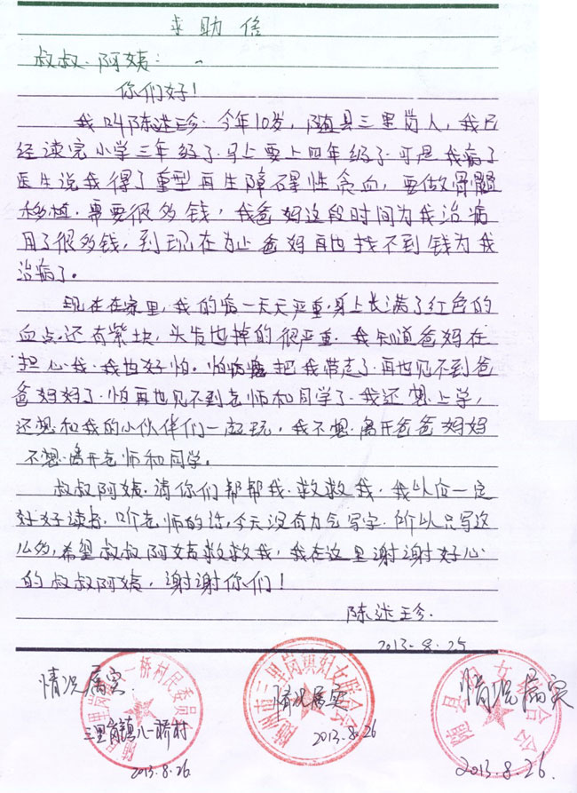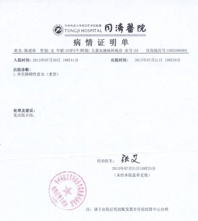 陈述珍每过十几天就得输注一次血小板和悬浮红细胞,每次费用三千多元左右,就在这个困难的关头,陈政的妻子提出了离婚。为了孩子陈政没有同意,妻子于是在去年11月选择离家出走,并且将手机号码都换了。