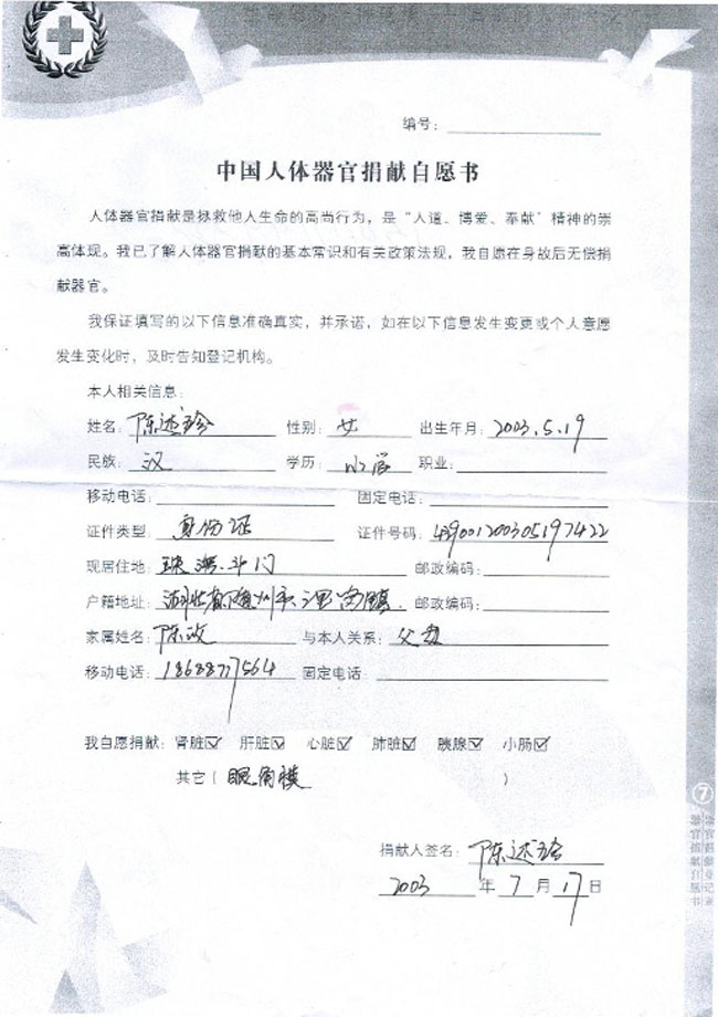 陈述珍当天上午跟着父亲陈政来到该市斗门区红十字会,由于该区没有权限签订捐献协议,陈政在工作人员指引下联系上珠海市红十字会,计划第二天乘车过去递交相关捐献资料。