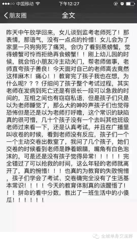 “昨天中午放学回来,女儿谈到监考老师死了!那表情,那语气,没有一点点的怜惜!女儿会为了家里一只狗狗死了痛苦,会为了看到蒸螃蟹,觉得螃蟹可怜而拒绝再食螃蟹!!刚上幼儿园的时候,就会怕小朋友冷主动关门,帮老师做事,老师直接夸孩子善良!今天面对自己的老师离去竟然这样麻木!痛心!!教育完了孩子我也在想,为什么呢???仔细问了孩子整个考试过程,其实老师在发病到死亡还是有很大一段可以急救的时间的,互相之间也有窃窃私语,但是孩子们只是以为老师睡觉了,那么大的呻吟声孩子们也觉得恐怖,但是还以为是老师打呼噜,这个常识的缺陷真的很可惜,几十个孩子没有一个去叫其他班级的老师过来看一下,还是认真考试,并且在广播里叫收卷的时候,看到老师没有反应,孩子们一个个主动交卷出教室了,我问了几个孩子,她们交卷的时候看到老师是睁着眼睛,嘴角有白色泡沫的,可是还是没有孩子觉得异常!!!!完全错过了可以抢救的时间,这么年轻的老师就离开了,真的惋惜!也真的为教育的失败惋惜,孩子们学会了考试、交卷,却完全没有了生活基本的常识!!!今天的教育体制真的该醒悟了!!拼命的看中分数,教出了一班生活中的小傻瓜!!!!!”