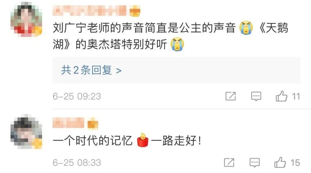一整天我心乱如麻,悲从中来,往昔幕幕在眼前,仍然那么鲜活。我们一起配《天鹅湖》,一起配《绝唱》……我这个观众眼里的配音“王子”一直是陪伴这位配音“公主”而存在着的,如今“公主”却先走一步了,怎么叫人不难过呢? …… 斯人已逝,留下的是无尽的思念。小刘,我们永远的小刘,愿你在天上轻松无病痛,自由地朗诵,歌唱!我们定会更加珍惜当前的生活,再为配音艺术做一点事情,再为可爱的人民做一点事情,至死无憾! 2020年6月25日匆匆落笔、改定 网友:她的声音太经典了!