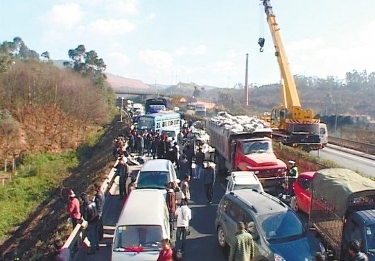 据事故现场的一位司机介绍,当天早上,该路段的能见度不到30米,事故中,后面的车子看不清状况才撞了上去。