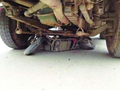 电动车被卡在肇事渣土车轮下