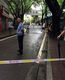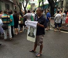 郑陈伟亲属在重庆四十二中校门手持郑陈伟遗像