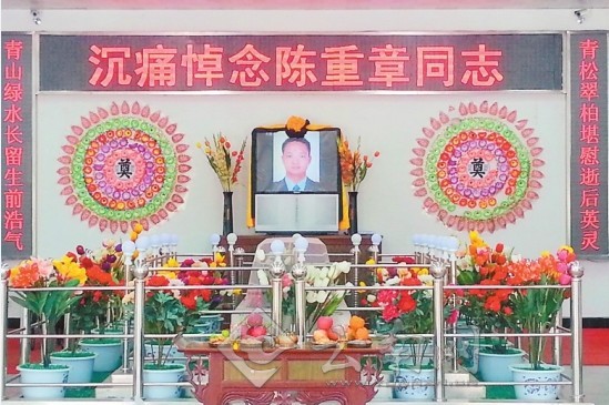 在安放陈重章遗体的玻璃柜后,悬挂着战友们精心为他制作的一副上书“青松翠柏堪慰逝后英灵,青山绿水长留生前浩气”的挽联。昨日上午,来自保山市各级各部门的干部、群众以及公安系统各条战线上的数百名民警在保山市殡仪馆,为17日在办案途中遭遇车祸牺牲的缉毒民警陈重章送行。