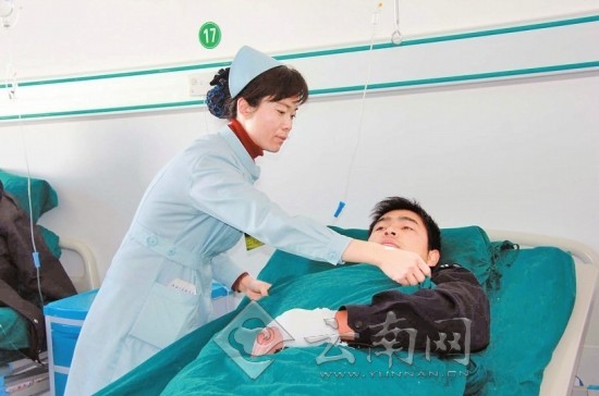 昨日上午10时30分,在陈重章送别仪式结束后,保山市相关领导来到武警保山医院看望刚从大理转院治疗的6名负伤警务人员,向他们送上了鲜花和慰问金。