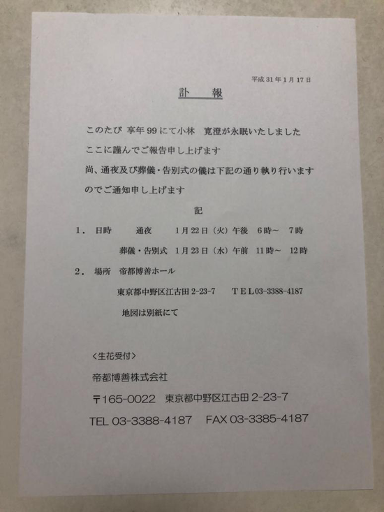 根据讣告内容,1月22日下午6点-7点是老人的守夜仪式,1月23日上午11点-12点是老人的葬礼和告别式,都在位于东京中野区的帝都博善大厅举行。