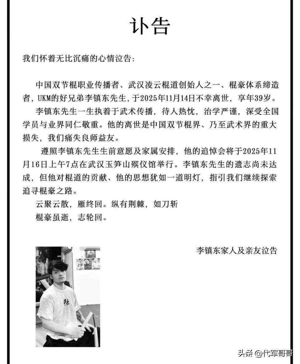 025年11月14日,一个令人心碎的消息传开了:中国双节棍界的代表人物李镇东先生,因心肌梗塞突然离开了我们,生命定格在了39岁。两天后的清晨,在武汉玉笋山殡仪馆,许许多多的武术爱好者、他的学生和同行好友赶来,一起送别这位把一辈子都献给双节棍推广的大师。他是武汉凌云棍道双节棍俱乐部的创办人,他的离去,让独树一帜的“凌云风格”成了绝唱,整个双节棍圈子都沉浸在了巨大的悲伤里。