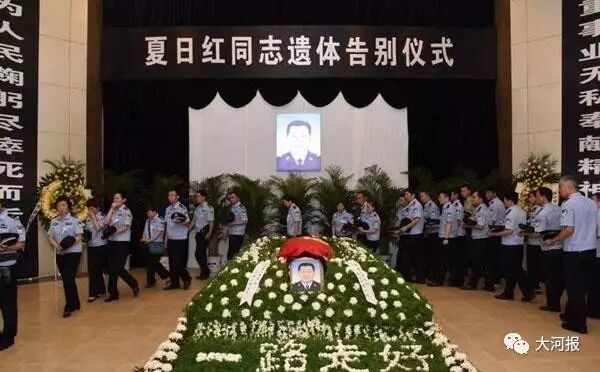 省公安厅副厅长、郑州市副市长、市公安局局长沈庆怀,省公安厅党委委员、河南警察学院党委书记王伟平,省公安厅政治部主任高万象等领导,和郑州市公安局各单位民警代表,以及夏日红同志亲属和生前好友1000余人,参加了遗体告别仪式,挥泪送别忠诚无悔的荥阳公安局长夏日红。