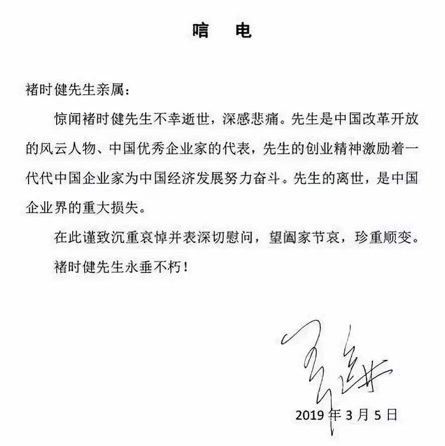 3月5日晚间,王健林向褚时健亲属发唁电。在唁电中,王健林这样评价褚时健:先生是中国改革开放的风云人物、中国优秀企业家的代表,先生的创业精神激励着一代代中国企业家为中国经济发展努力奋斗。先生的离世,是中国企业界的重大损失。褚时健先生永垂不朽!