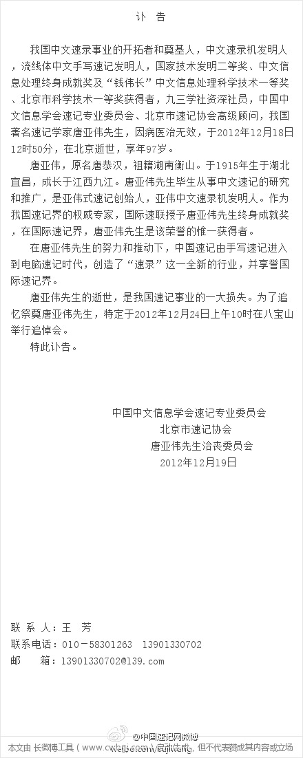 讣告 中国速记泰斗唐亚伟先生在京去世,享年97岁