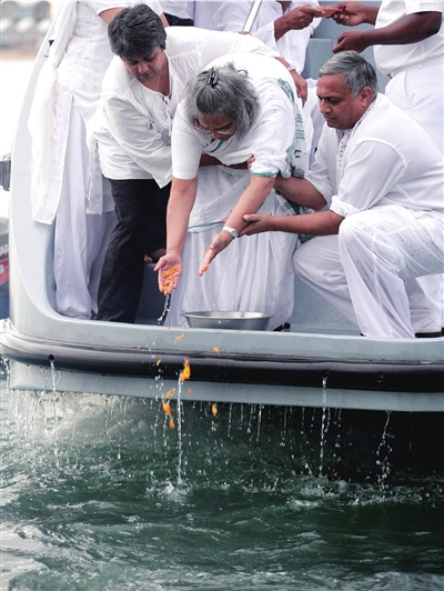 1月30日,甘地孙女埃拉·甘地(中)在南非德班附近海域将甘地骨灰撒入大海。 新华社/路透