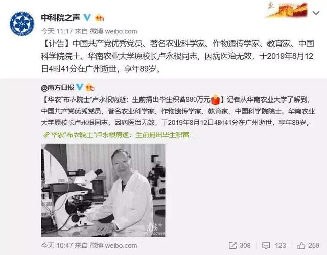 8月12日凌晨,中国科学院院士、我国著名作物遗传学家卢永根因病医治无效逝世,享年89岁。