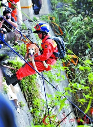 台湾搜救人员带上搜救犬进行搜救。 新华社发