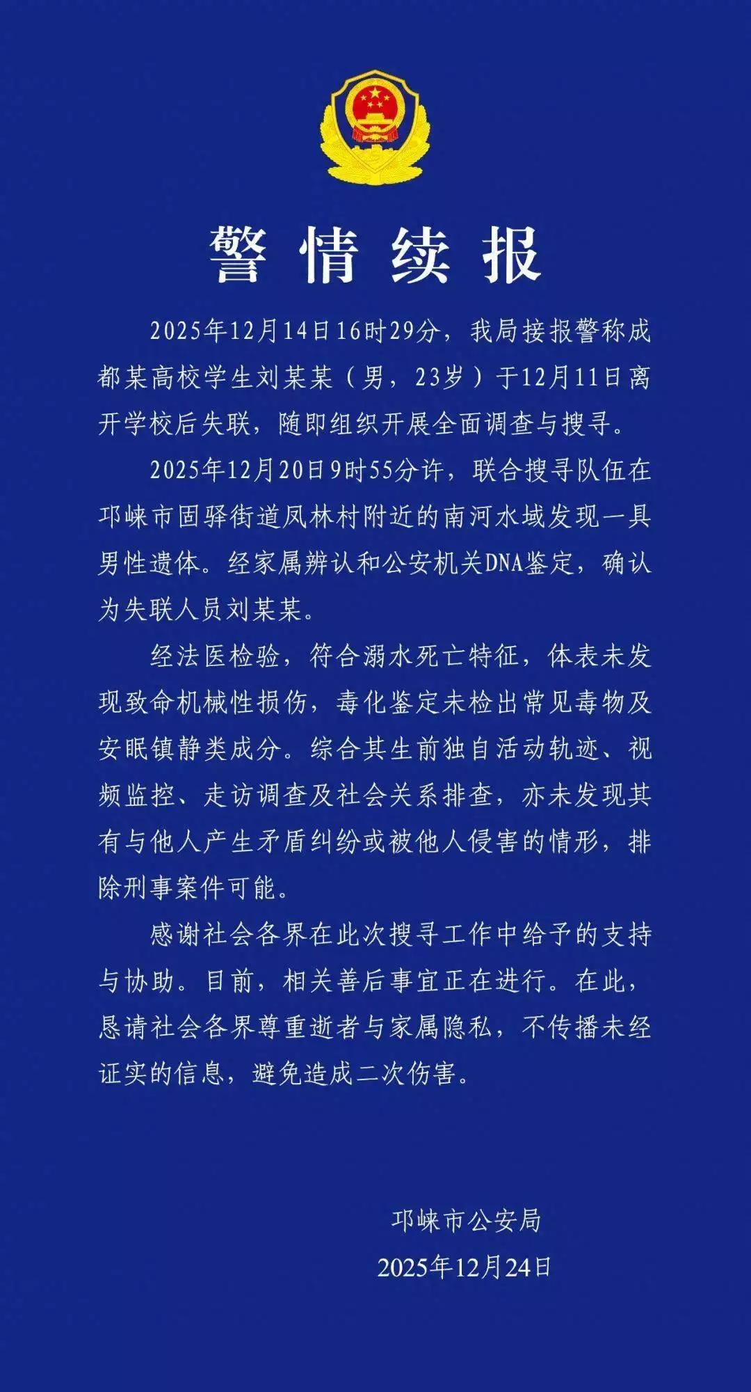 2025年12月14日16时29分,我局接报警称成都某高校学生刘某某(男,23岁)于12月11日离开学校后失联,随即组织开展全面调查与搜寻。
