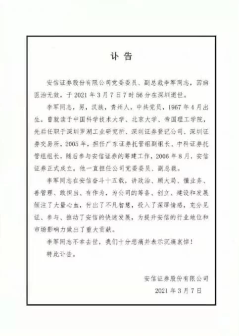 安信证券发布讣告,安信证券股份有限公司党委委员、副总裁李军同志因病医治无效,于2021年3月7日逝世。