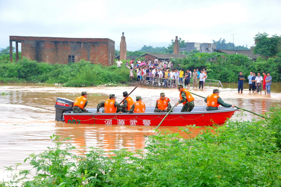 武警河源支队接到该市三防指挥部电话后,支队长黄福民率葛晓威等27名官兵组成的救援分队,火速赶赴受灾地域,与当地民兵和公安干警迅速将蓝口镇政府周边1800余名被困群众转移至安全地域。