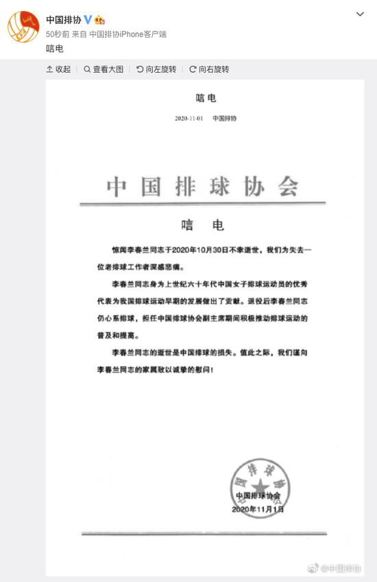 @中国排协 官方微博1日消息,中国排球协会发布唁电,惊闻李春兰同志于2020年10月30日不幸逝世,我们为失去一位老排球工作者深感悲痛。
