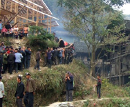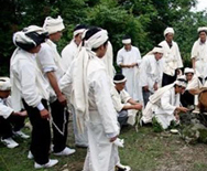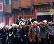 上祭于死者去世后第二天举行,祭品须有鸡、鱼、肉“三牲”,诵毕祭文,锣鼓、唢呐、铁炮齐鸣,加上道士的念唱和妇女的哭声,整个葬礼显得十分隆重而悲哀。此外,还给每个参加葬礼者发一条白孝巾,扎在头上为死者戴孝。在棺木入土之前,把纸钱、树枝、杂草丢在空中燃烧,又杀死一只鸡丢进去,让它在火中蹦跳至气绝才取出.最后沉棺于穴中埋葬。
