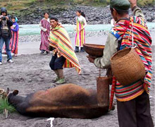 人死后的第三天,便由死者家属领祭品捧到屋后扫净的坡地上放好。