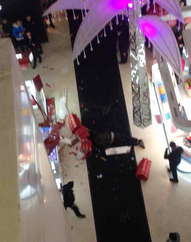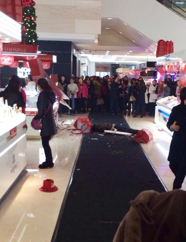 12月8日下午,一名男子从徐州金鹰彭城广场店七楼坠下身亡。现场一片狼藉,柜台被砸烂。根据周围民众的描述,该男子系自己跳楼自杀。该男子与女友购物时男子嫌贵,发生争执后,男子一气之下跳楼。12月8日下午,一名男子从徐州金鹰彭城广场店七楼坠下身亡。现场一片狼藉,柜台被砸烂。根据周围民众的描述,该男子系自己跳楼自杀。该男子与女友购物时男子嫌贵,发生争执后,男子一气之下跳楼。