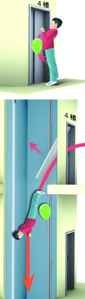 电梯层门下端突然脱离墙体,亮亮随着惯性坠落电梯井