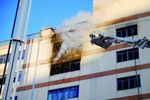 昨天上午,北京晨报记者在现场看到大楼东西两侧的窗户仍有浓烟冒出。西侧楼下聚集着十余辆水罐消防车,同时开动保证供水。经过20多个小时的喷水救援,一楼的几个出口正在不断往出淌水,地面冰水混合在一起,西侧墙面大面积结冰,不时有冰凌坠落摔碎在地。