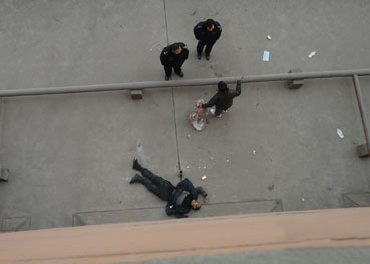 走上平台的警察证实该男子已死亡。该男子40岁左右,身着深色棉衣,留有整齐的胡须,右脚皮鞋裂开,身边是砸裂的通风管。