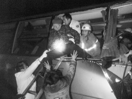 清晨6点10分,成都军区总医院120接到任务。10分钟后,救护车已停在事发现场。成都军区总医院急诊科医生蔡钦说,当时现场一片狼藉,大客车的车头和右侧撞得支离破碎。车外,站着一些未受伤的乘客和轻伤者。