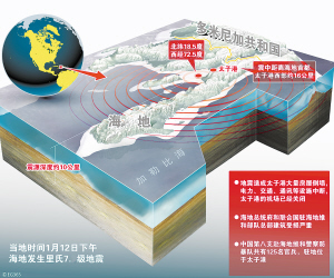 据了解,这是海地200多年来破坏力最大的一次地震,也是加勒比地区有记录以来强度最大的一次。地震后又发生18次余震,其中强度最大的两次震级分别为里氏5.9级和5级。