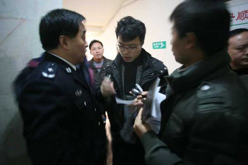 安顺市公安局分管刑侦的副局长冉太有在楼梯口被媒体再次堵截。图/潇湘晨报滚动新闻记者 曾鸣