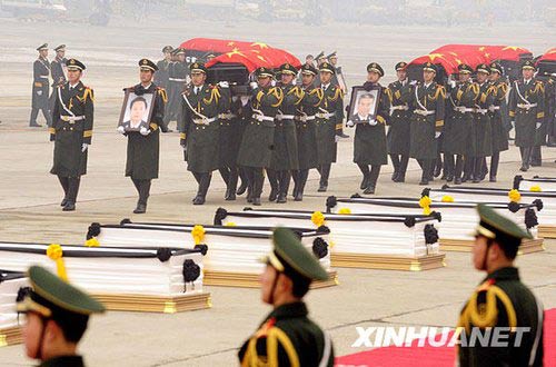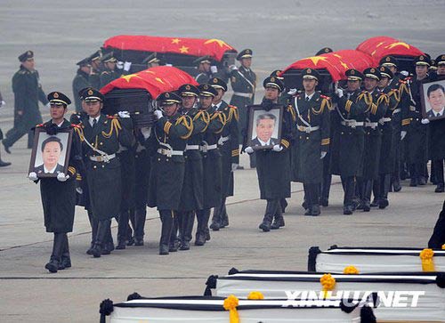 1月19日,礼兵护送八位烈士的灵柩,灵柩上覆盖着中华人民共和国国旗。当日,专程接运在海地地震灾害中遇难的八位中国维和警察灵柩的专机抵达北京首都国际机场。新华社记者金良快摄
