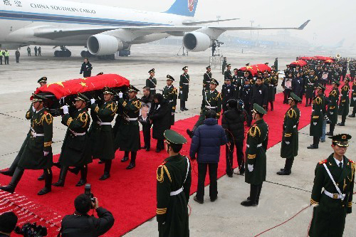 19日上午,北京首都机场举行了迎接八位遇难中国维和警察灵柩回国仪式。10时54分,在礼兵的护送下,朱晓平、郭宝山、王树林、李晓明、赵化宇、李钦、钟荐勤、和志虹八位英烈的灵柩被缓缓抬下专机,灵柩上覆盖着中华人民共和国国旗。