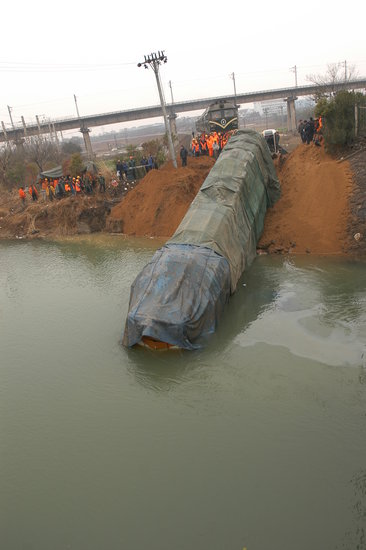 2010年1月22日,江西南昌向塘西站二场附近的王家桥河,施工人员准备将掉进河道的火车头牵引上岸。据悉,1月21日18时许,向塘西站一辆载有45节车厢的货运火车头,由于司机操作失误,不慎开进了河内,所幸没有人员伤亡。事发当天,南昌铁路部门立即组织人员进行施救,并将整个车身用一层雨布罩上,由于车体较重,地形复杂,不便于吊车作业,只好采取动力车牵引的方法紧急施救。
