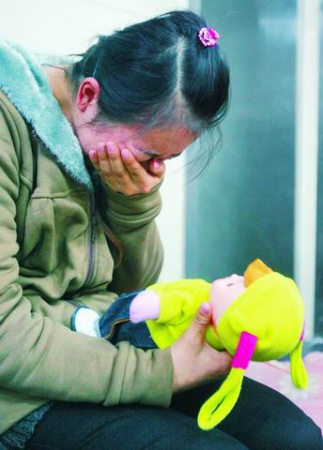 1月31日中午,在郑州市儿童医院重症监护室门外,孙梅坐在长凳上,双手抱头,不停地哭泣,身边,是她刚刚给儿子买的一套新衣服和一个布娃娃。“当时接到电话后,就连夜回来了,今天早上6点多到的。”一下车,孙梅便立马赶往医院,并于当天晚上第一次见到了儿子,“真是惨不忍睹,浑身被打得伤痕累累,恨死他了。”没有说完,孙梅再次哭泣不止。