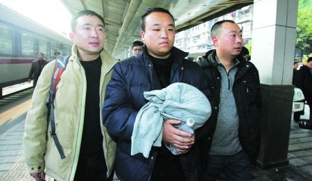 昨日,菜园坝火车站,嫌疑人李兵(中)被民警押解回渝 记者 龙在全 摄