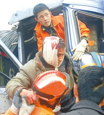 青银高速高密段,消防人员从事故车辆上救出伤者。