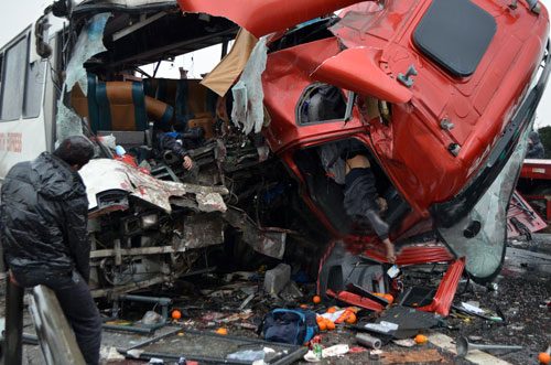 昨日上午8时59分,天下着大雨。樟树市消防大队接到群众报警称,在昌樟高速公路往临江方向6公里处(肖江大桥附近)发生一起交通事故,一辆山东牌照大客车与一辆山东牌照长途运输大卡车相撞。樟树市消防中队立即出动消防官兵赶赴现场。