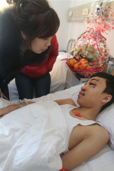 据付佳伟的主治医生鄂春旭介绍,付佳伟被送到医院时面部带血,肢体严重肿胀,还伴随有呕吐的症状。经进一步诊治,确诊付佳伟腕部骨折,颅内出血,颅骨也有轻微的骨折,但没有生命危险,大约2至3周左右可以出院,但出院后还需长时间静养。